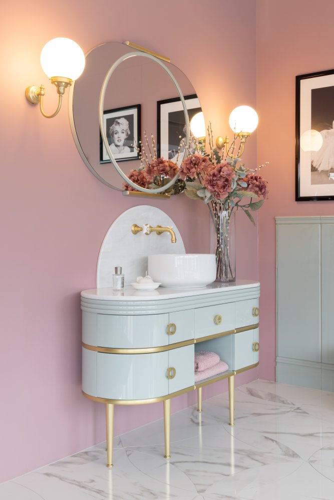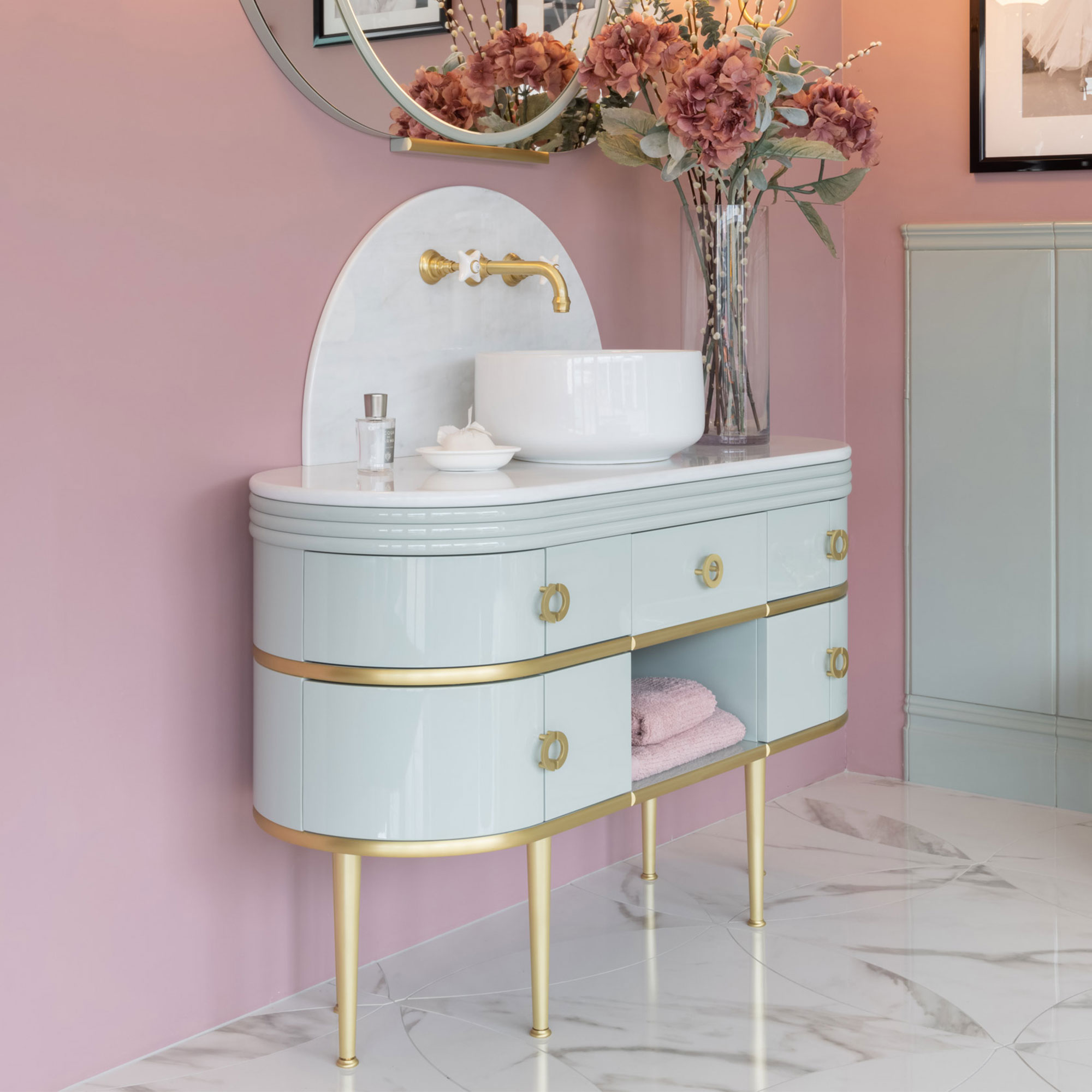 Devon & Devon Scottie Vanity Unit in Dusty Sage with Brushed Brass Trim and Carrara Marble Top
