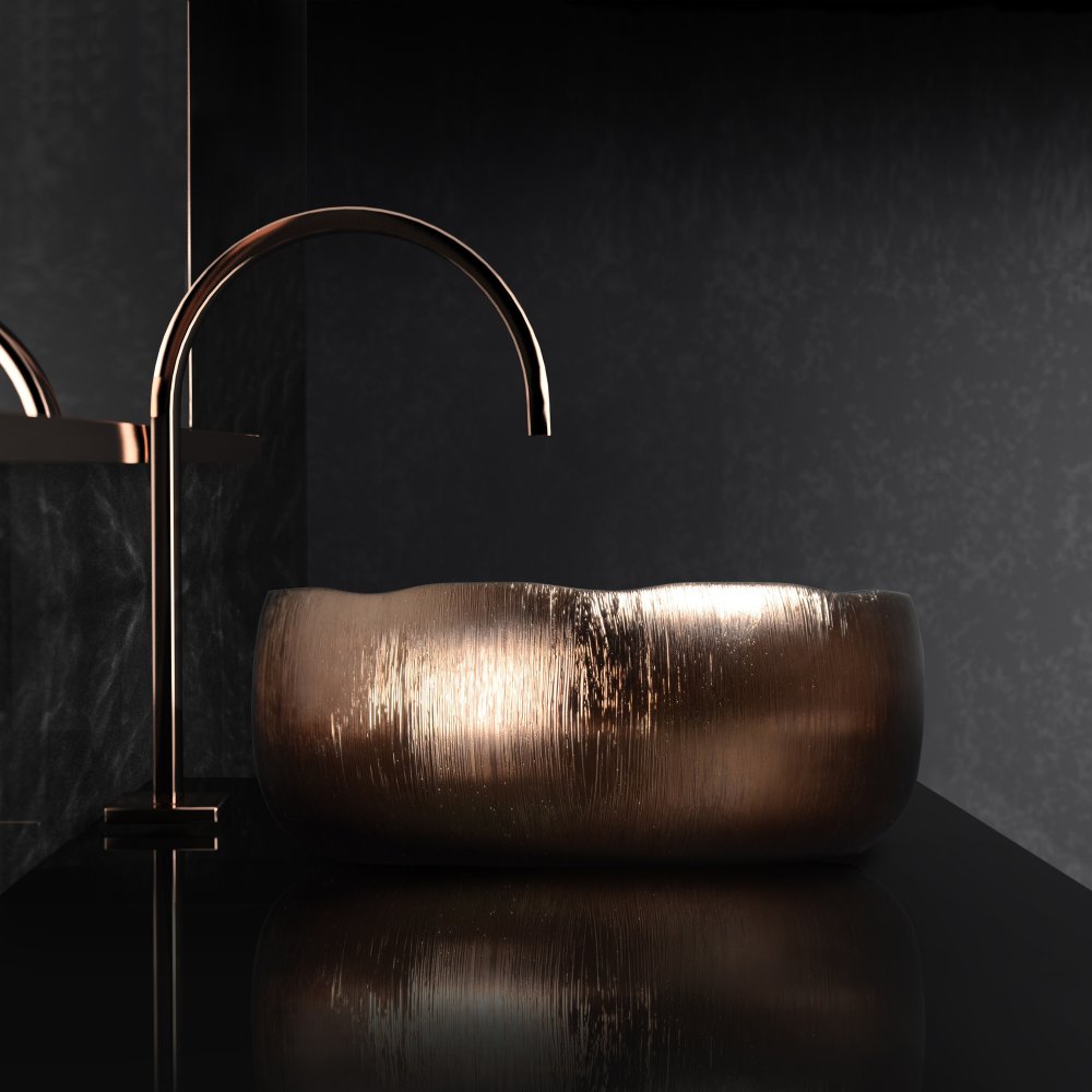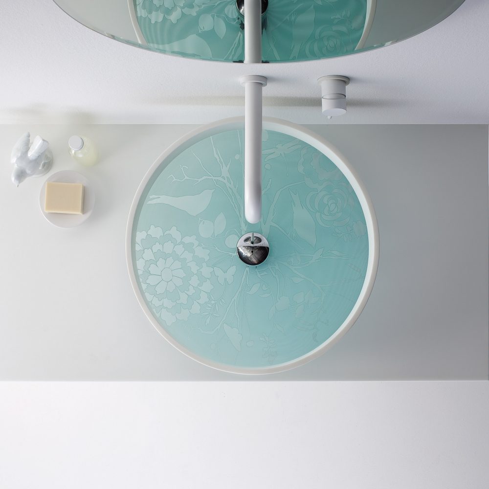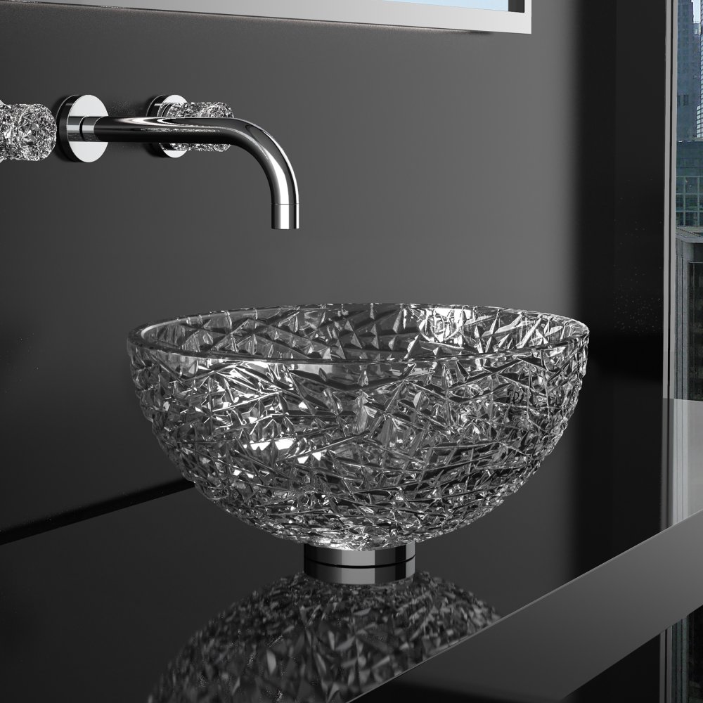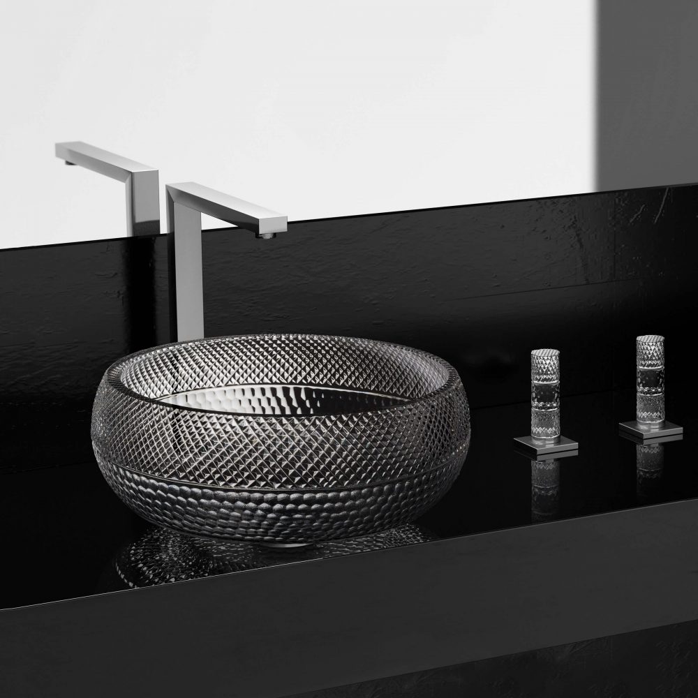 The premium basin, shown in clear and storm grey finish, is a beautifully crafted basin crafted from De’Medici® 24% lead crystal. The relief on the outside creates a playful reflection of the lights whilst the inside of the basin is smooth for a seamless stream of water. Made in Italy using artisanal crystal forming and decorating techniques.