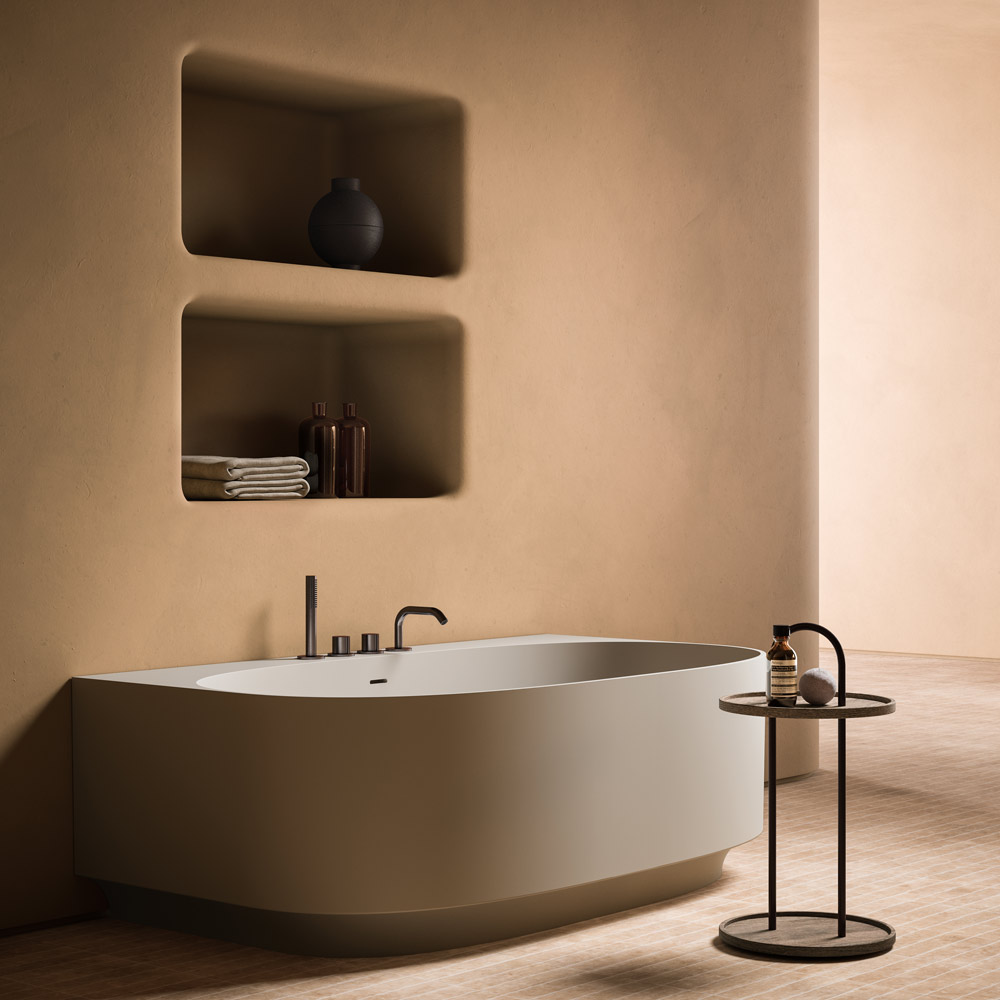 The Beam bathtub designed by the Sans Nom and Salaris studios – features a base with strict lines that draws its inspiration from the metal architectural profiles, and contrasts with the soft lines of the body in LivingTec. The base it rests on is the element that symbolises the character of the bathtub. The various combinations of materials, colours and finishes provide an ever-innovative visual appeal that can be adapted to any bathroom. In addition to its general visual appeal, the way the base is designed allows the bathtub’s technical elements to be hidden from view. This makes the bathtub suitable for use in the middle of the room or along a wall.