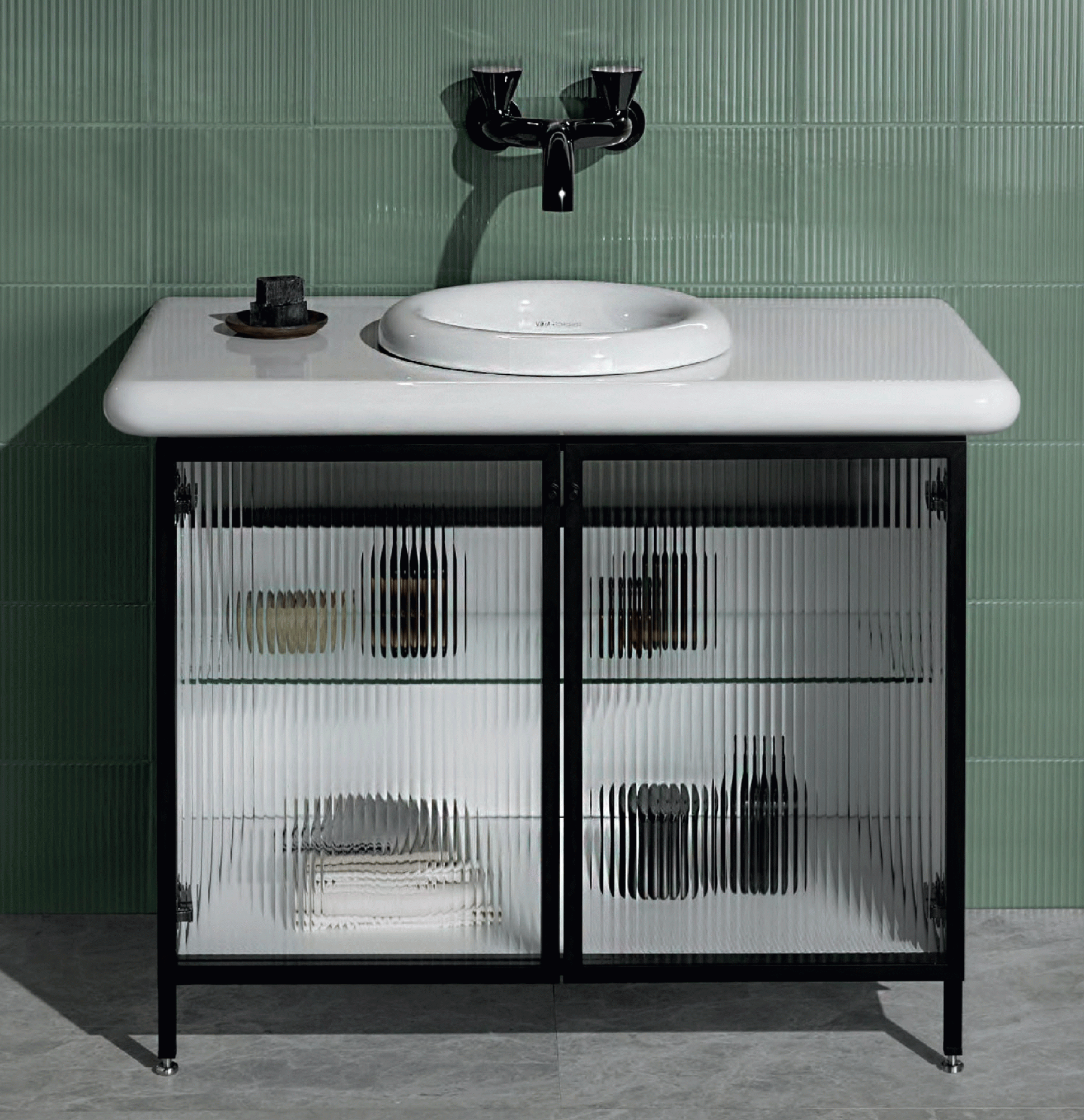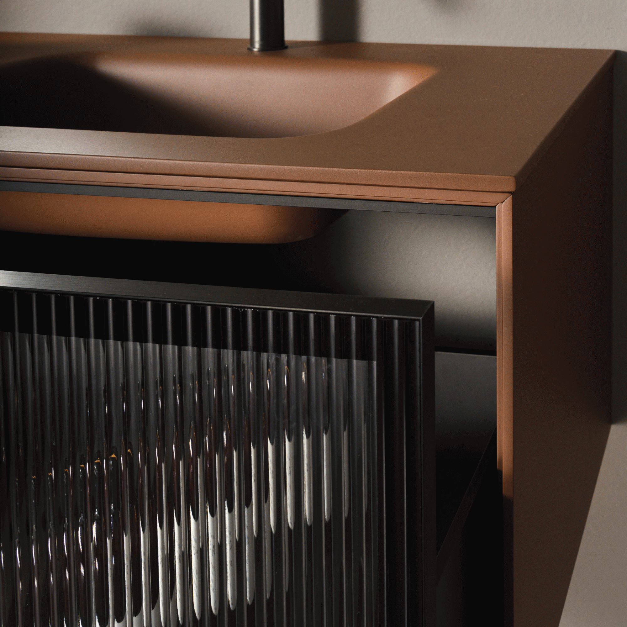 Fluted glass doors and vertical ridges add a decorative element to the bathroom furniture. They can be made from a variety of materials such as wood, glass and marble and can be customised to fit the specific aesthetic and functionality of the space.
