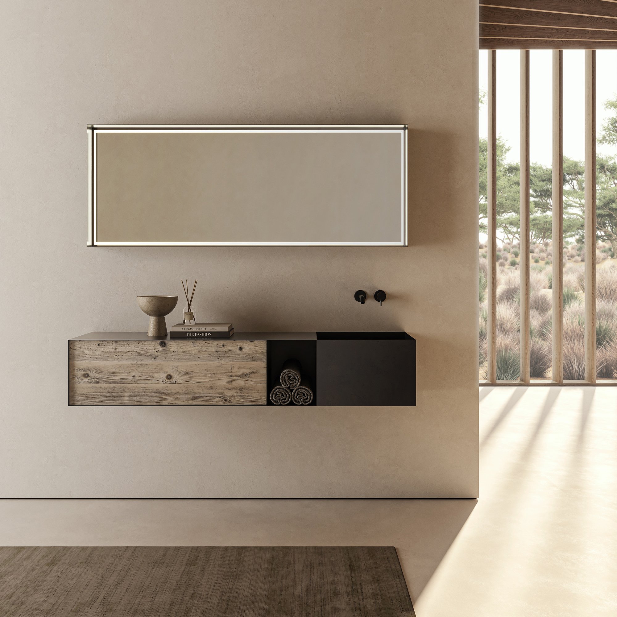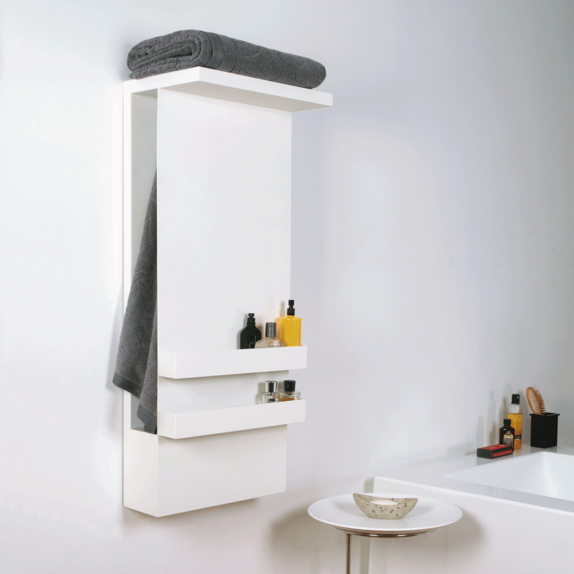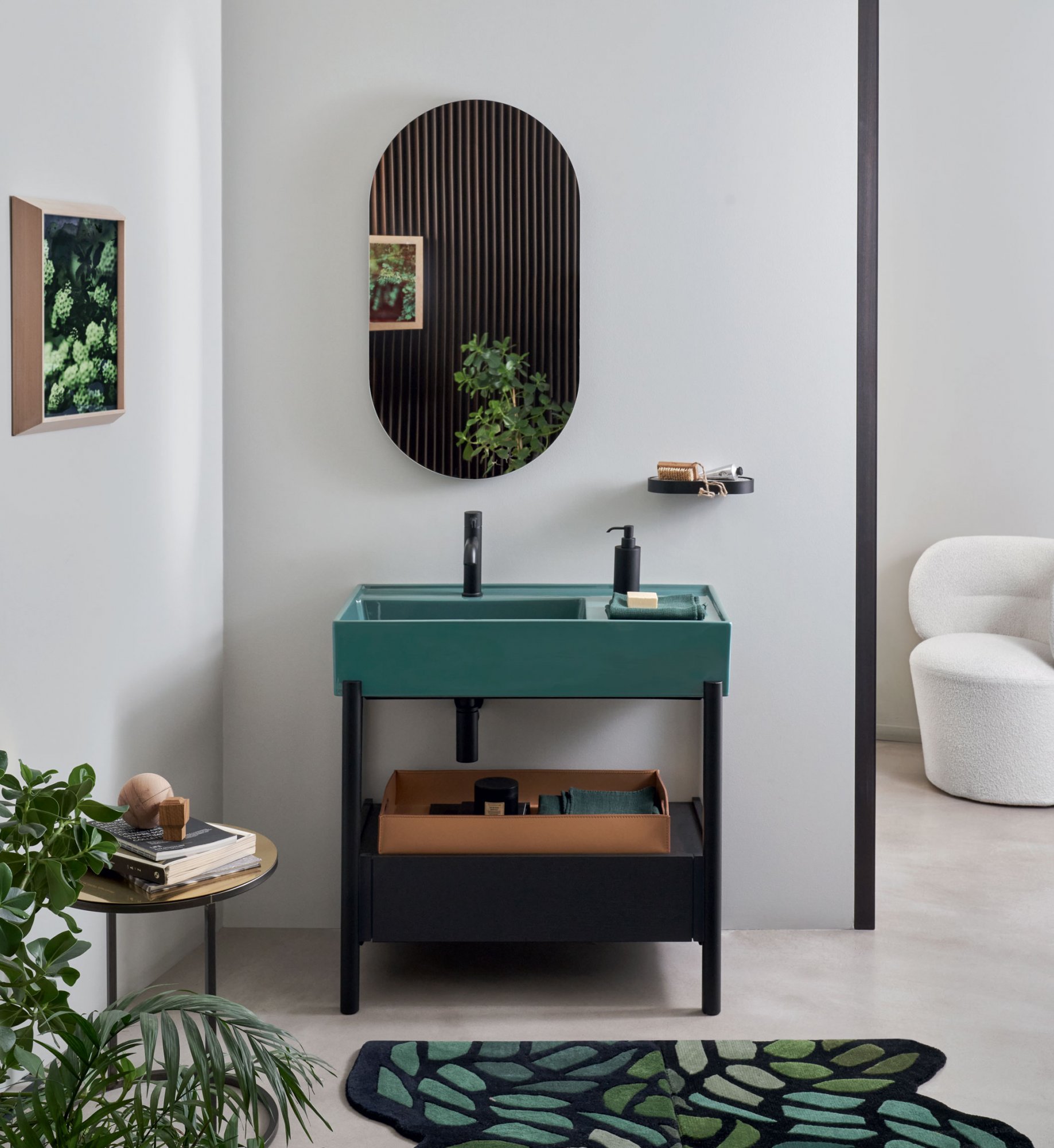 The Arco Mirror features geometric oval and round shapes along with versatility and functionality. This is therefore the main feature of the entire collection. However, they now offer a series of smaller mirrors with hidden shelves.